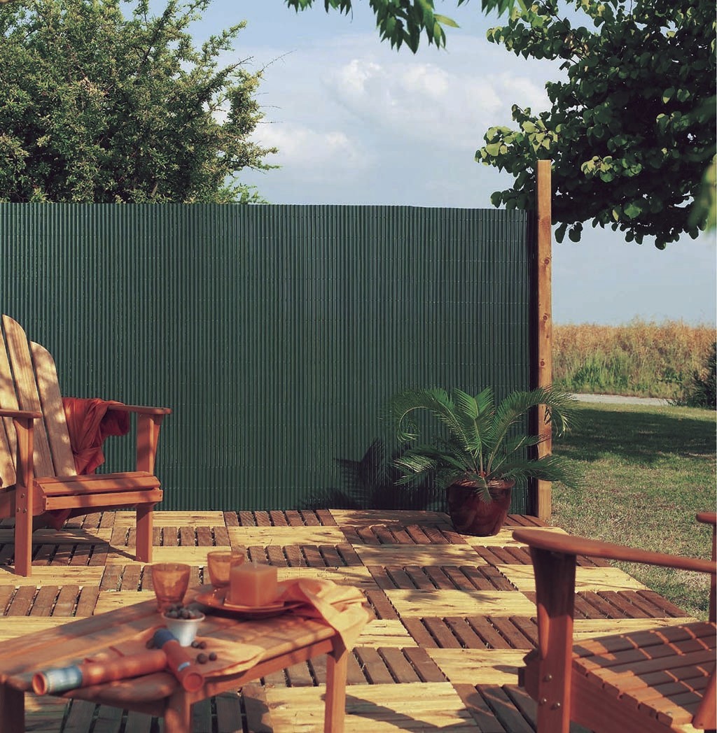 Canisse synthétique décorative, simple et fonctionnelle. Profil semi-ovale. Sans entretien. Caractéristiques : Matériau : PVC. - Occultation 85 %. - Largeur de latte : 17 mm. - Poids : 900 g/m2. - Dimensions : 1,5 x 3 m. - Couleur : vert. - Assemblé avec du fil de nylon Ø 0,7 mm et collé aux extrémités sur les 5 dernières lattes. - Avec traitement anti-UV.