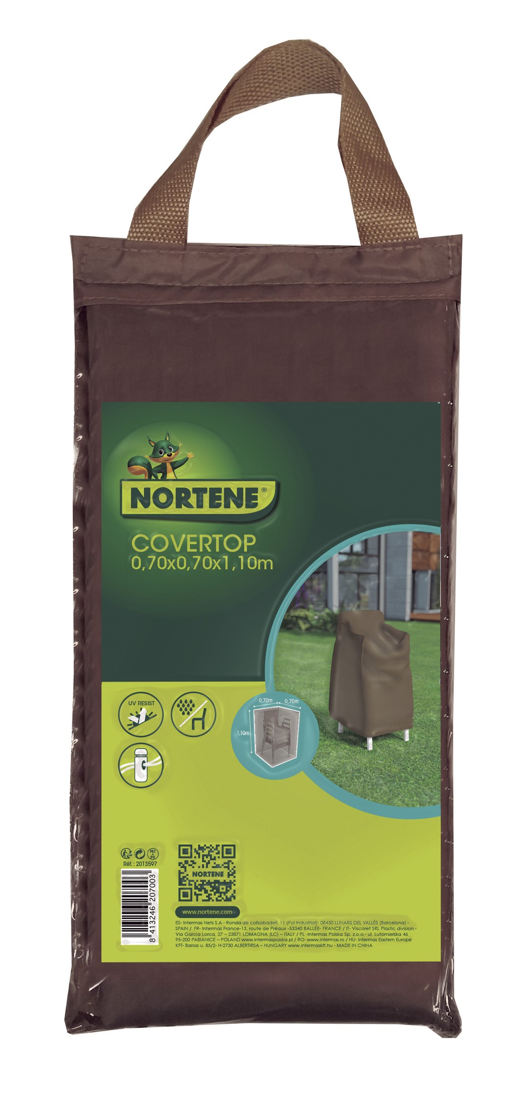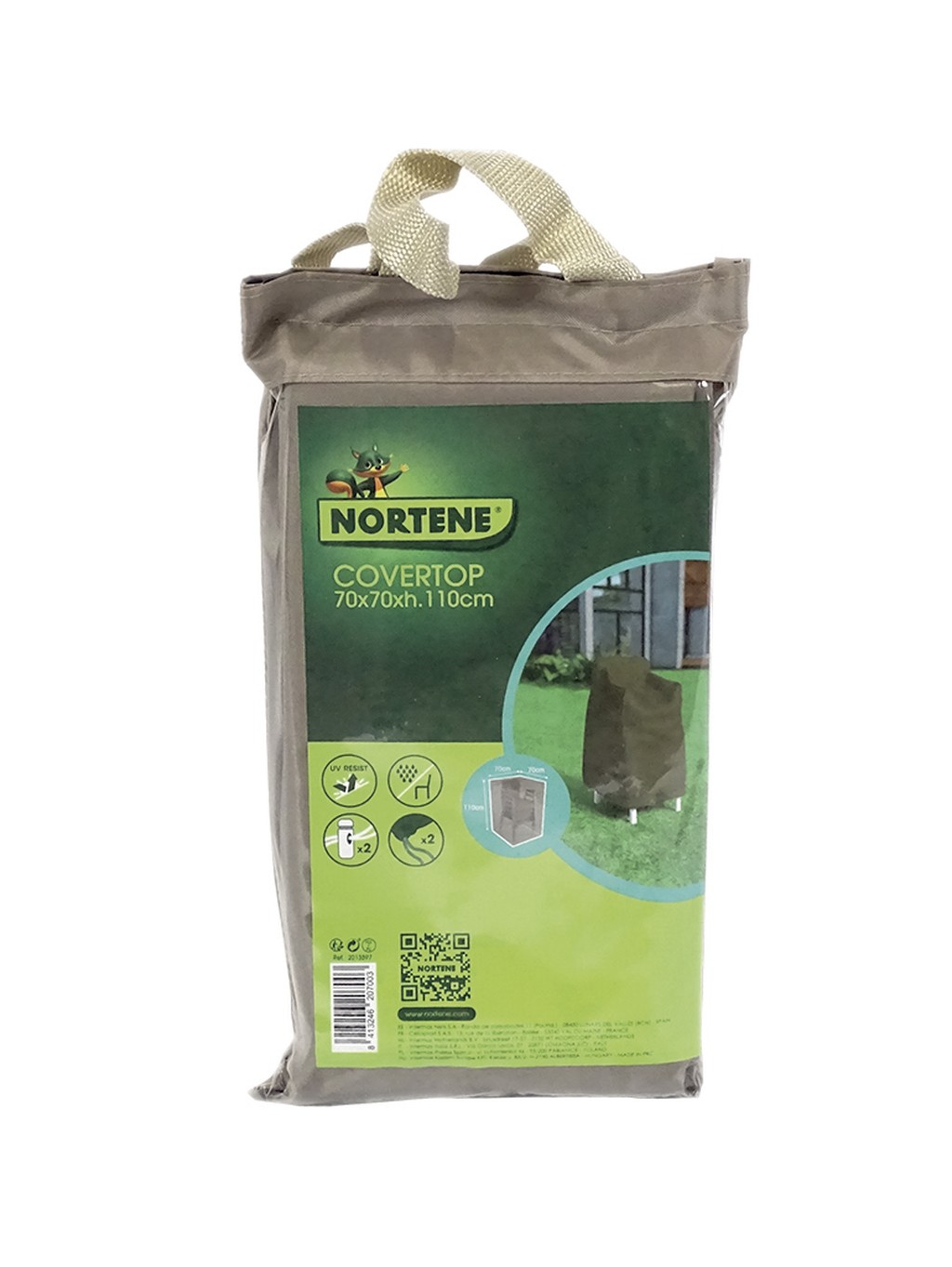 Dimensions : 70 x 70 x h.110 cm Matériau : polyester recouvert de polyuréthane. Avec protection UV et double couture. Imperméables. - Poids : 90 g/m2. - Couleur : vison/taupe.